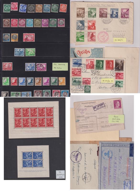 Germany 1933-45 3rd Reich mint & used colln of Germany, German Occupations & puppet governments on large s/b pages. Noted: 1933 1Mk Chicago Zeppelin flight FU (£650); 1938 Zeppelin Sudetenland flight cover; various m/ss FU; censored & reg’d covers etc.; 1944 airmail POW card to NZ & other field post covers. Alsace-Ukraine occupation issues incl German ovpts as well as stamps issued under occupation governments. Noted: Netherlands Legion pair of m/ss mint (SG 560a,b); local issues (eg: Belgium Wallonia Legion set) mint; Italian Occupation; & propaganda issues (eg: Azad Hind) etc. Little or no dupn apart from Ukraine. Germany cat £3700+, & occupations etc cat approx £1250. (Image)