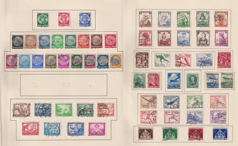 Germany 1933-45 colln on pages, all used except 1945 SS Troops pair (MUH). Noted: 1933 Wagner set, 1934 Zeppelin set, 1935 Costumes set, 1939 Horse Racing set & 1939 Danzig ovpts set. 392v. Vendor STC £2400. (Image)