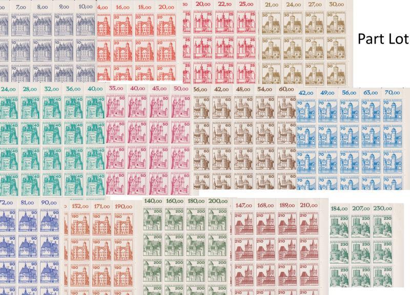 Germany 1977-9 Castles set in full sheets (unfolded) of 100. Also, similar but from West Berlin. Scott 1231-42 & 9N391-403. Cat US $1315 & US $1050 respectively. MUH. (Image)