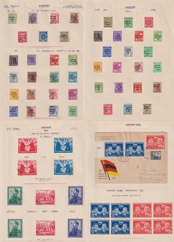 Germany-Russian Zone 1945-9 & also East Germany 1950-6 mint & used ranges on pages. Noted: 1948 ovpts set used, 1949 Goethe m/s mint & used; East Germany 1950 Debria m/s mint, used & FDC, Scientists set mint & used; 1952 China Friendship sets mint & used; 1954 Marx m/s (perf) & imperf set mint & perf pair tied on cover. 537v, 17 m/s, 17 covers. Vendor STC £7200+. (Image)