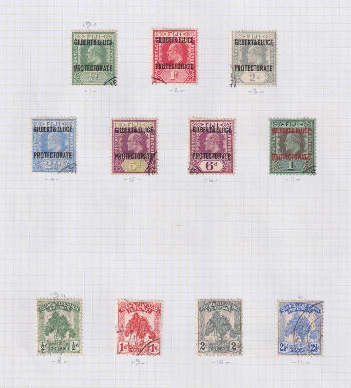 Gilbert & Ellice Isl 1911-74 fine used colln on pages, identified by SG Nos. Noted: 1911 ovpt set (CTO), Pandanus Pines; GV to 1/- plus 5/-; SJ set; then apparently complete (except no 1956 10/- QEII Pict). (Image)