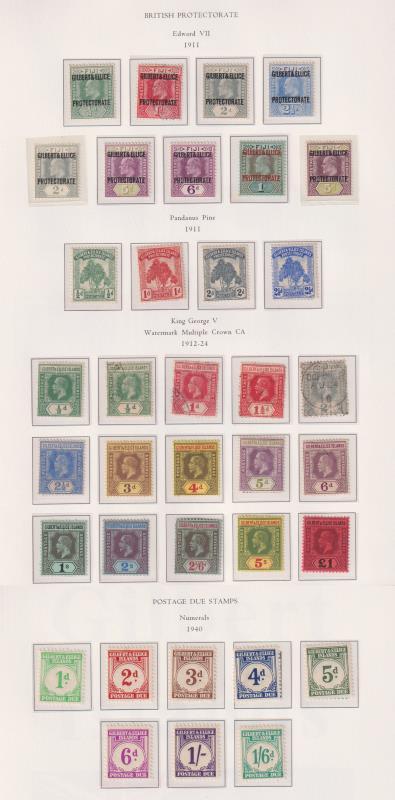Gilbert & Ellice Isl 1911-75 virtually complete colln mint/MUH/used on hingeless pages. Noted: GV 10/- & £1 mint, 1940 Postage Dues set MUH. Also incl a few Gilbert Isl issues to 1978. Cat £1630+. (Image)