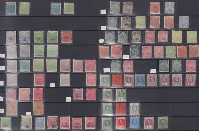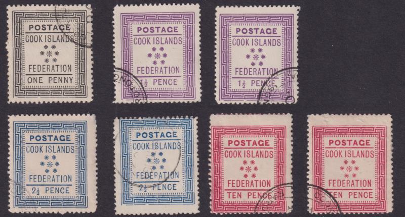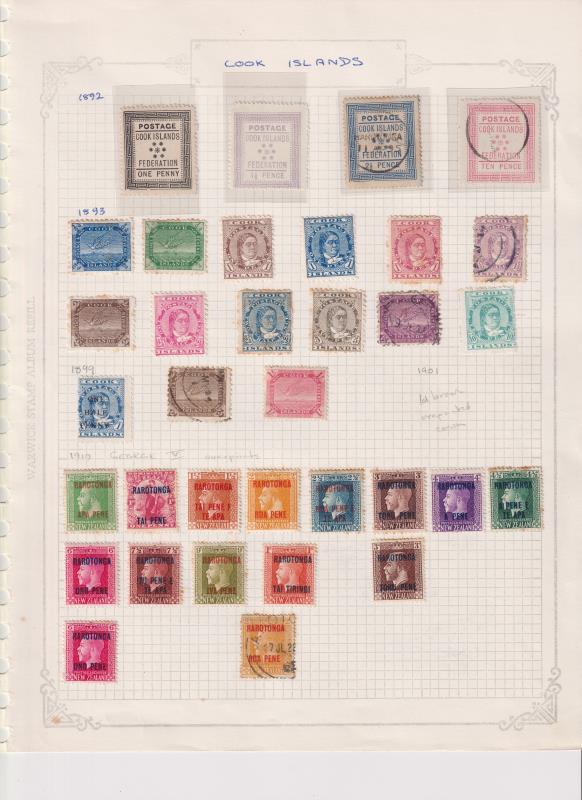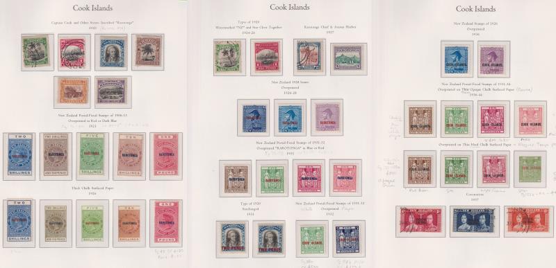 Cook Isl 1892-1919 seln of 40 mint & 19 used on pages. Noted: 1892 Federation (1d, 1½d x2, 2½d x 2 & 10d x 2, all with black circ pmks), 1893-1900 Queen Makea/Tern p12 x 11½ & p11 mixed mint & used sets incl 10d p12 x 11½ mint & 1/- deep carmine p11 mint, 1901 Queen Makea 1d brown crown ovpt MNG, 1902 NZ & star wmk set of 9 mint, 1913-19 chalk surfaced paper mixed mint & used set of 6. SG cat £1600+. (Image)