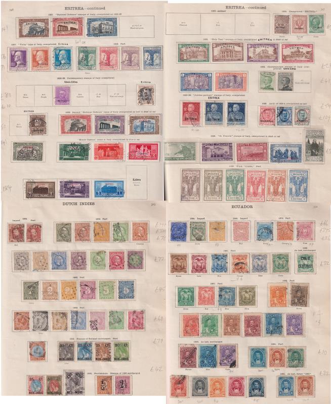Diego Suarez to Eritrea (foreign) 1864-1936 seln of mint & used on 44 pages. Noted Dutch Indies King William III 1864 10c carmine imperf & 1868 10c carmine p12½ x 12 GU/FU, Ecuador 1866 4r dull rose mint. SG cat £6520. (Image)