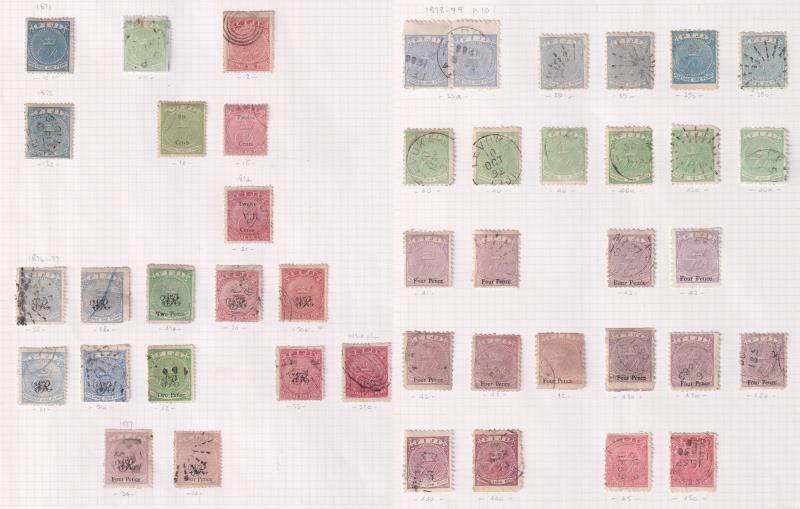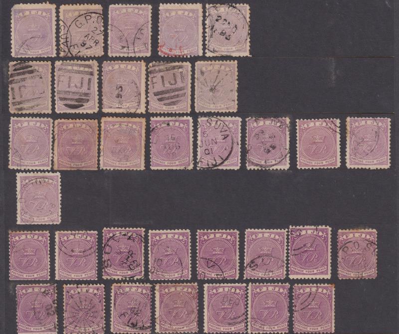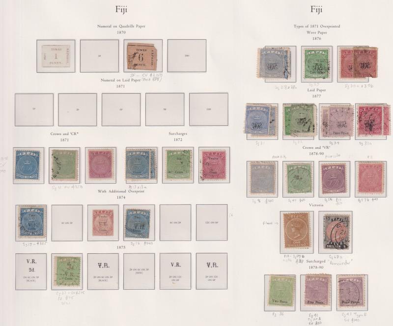 Fiji 1871-1972 used colln on pages, identified by SG No's. Noted 1871 1d, 3d & 6d "CR" set of 3; 1872 local currency surcharge set of 3; VR ovpts x 13; VR issues (incl surcharges) x 62; 1881-99 1/- x 11 & 5/- x 3; EVII to 5/-; £1 GV x 2 (both dies); virtually complete from 1935 SJ (about 500 stamps). High cv. Also various other vars (some mint incl 2½d on 2d GVI minor flaws study). (Image)
