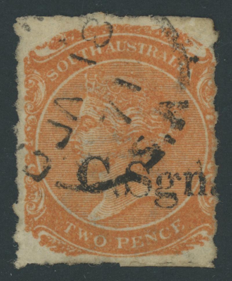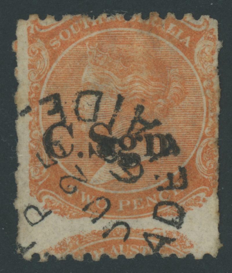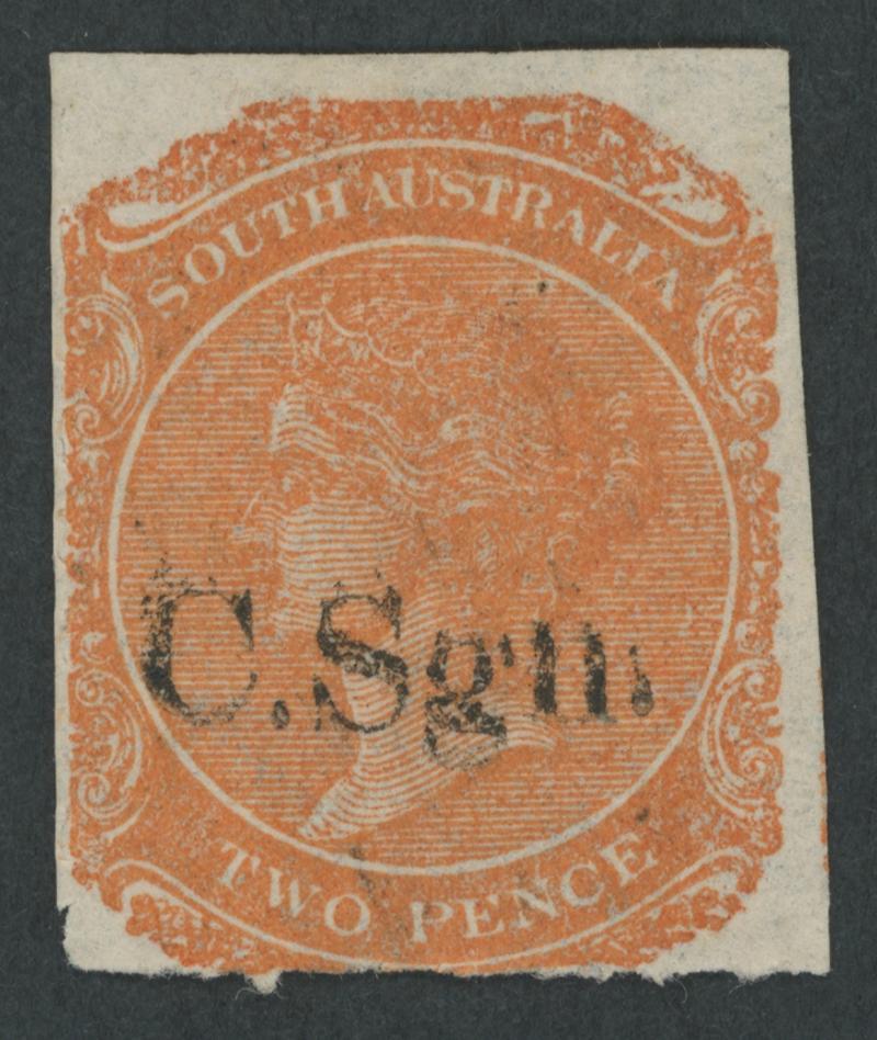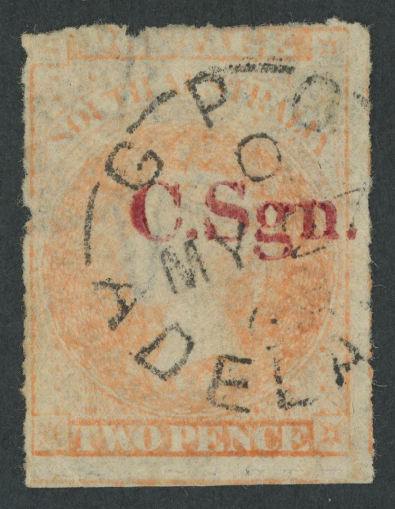 BLACK OVERPRINT: 'C.Sgn.' (hybrid overprint with Block 'C.S' & Seriffed 'gn.') on QV De La Rue Crown/SA Wmk Rouletted 2d red-orange SG DO164a with the Watermark Reversed, rouletting on all sides, a couple of small separation faults & an ironed-out minor crease at upper-right that is not evident from the face, Gambierton cds of 'JU23/69', Cat £5000. Not listed used by Ron Butler and the only recorded example so it should be rated RRRRRR. Ex Don Pearce: sold for $8685 (Sale 247 Lot 120). Absent from 'Besancon'. One of the great rarities of the Departmentals Series. (Image1)