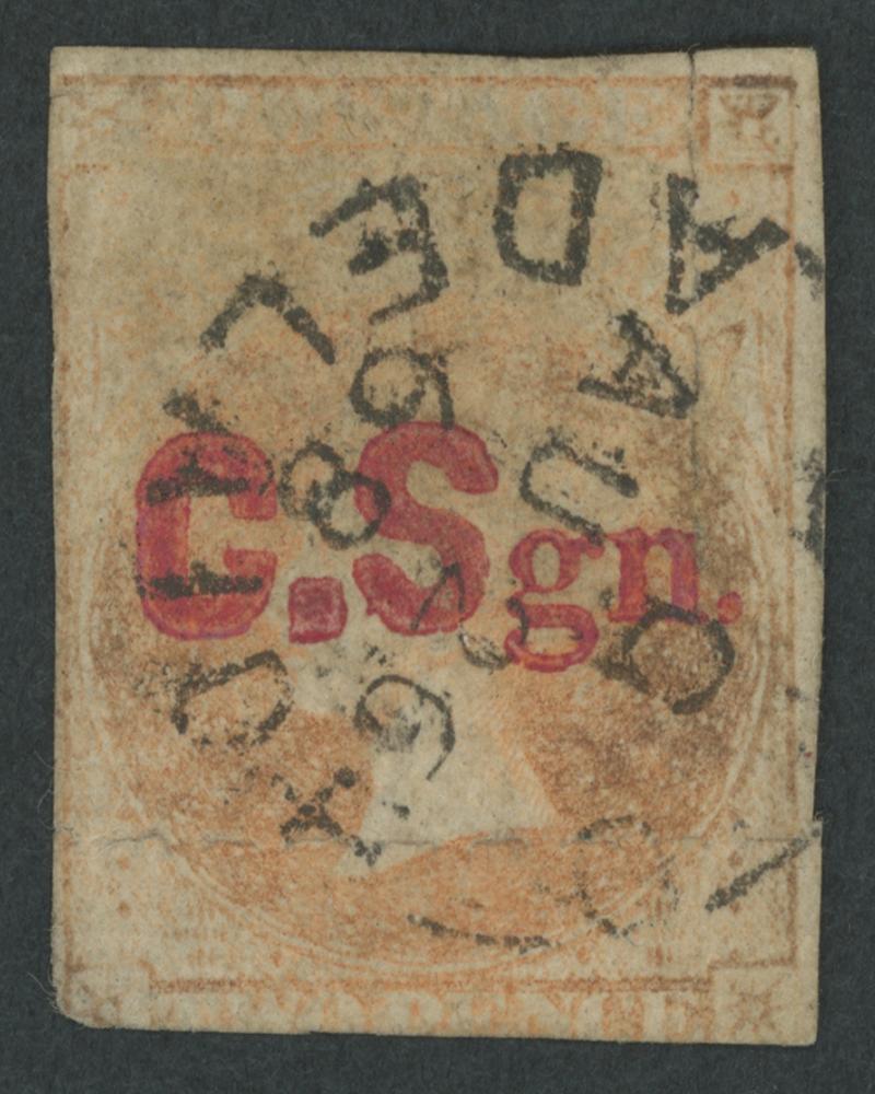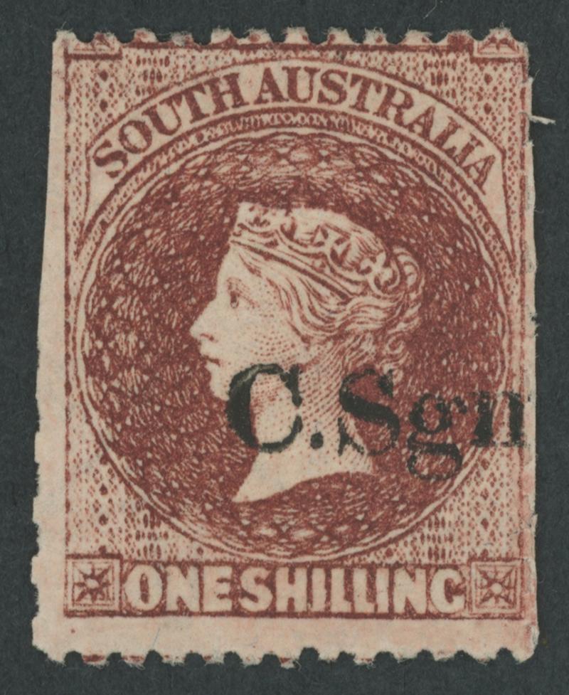 BLACK OVERPRINT: 'C.Sgn.' (seriffed font) on QV Perkins Bacon Large Star Wmk Perf 11½-12½xRouletted 1/- bright red-brown, some trimmed roulettes at left, unused, unlisted by Gibbons. Rated RRRRRR = only one example recorded; not recorded used. Ex Baron von Ferrary, Theodore Champion and Philip Croker. Chris Ceremuga Certificate (2009) states "Great rarity". Absent from the 'Besancon' and Don Pearce collections. This is also the only 1/- stamp - unused or used - recorded for the Colonial Surgeon. (Image1)