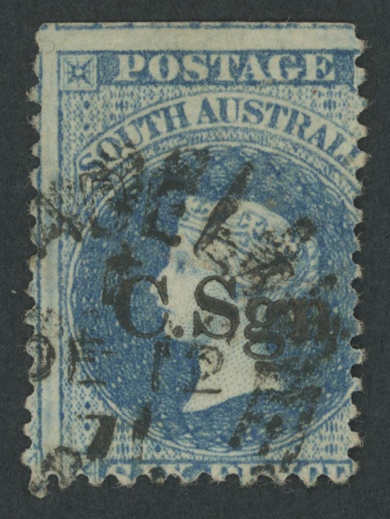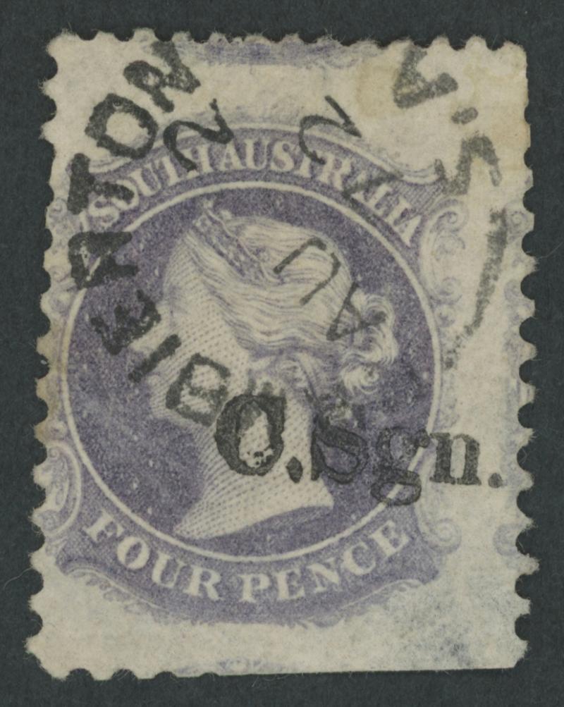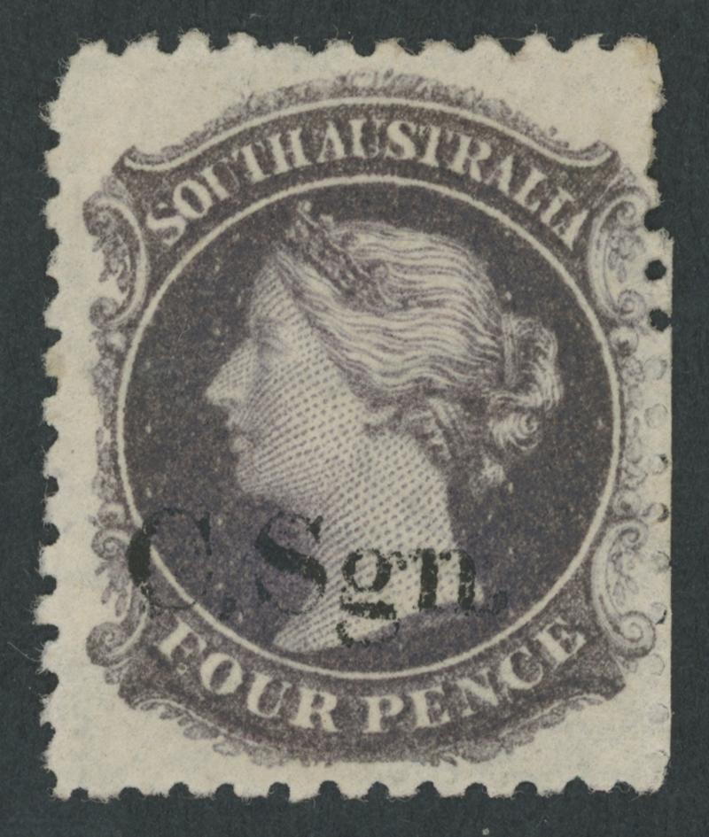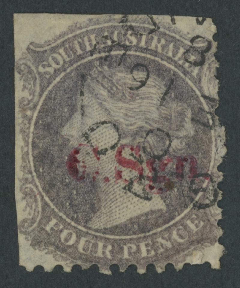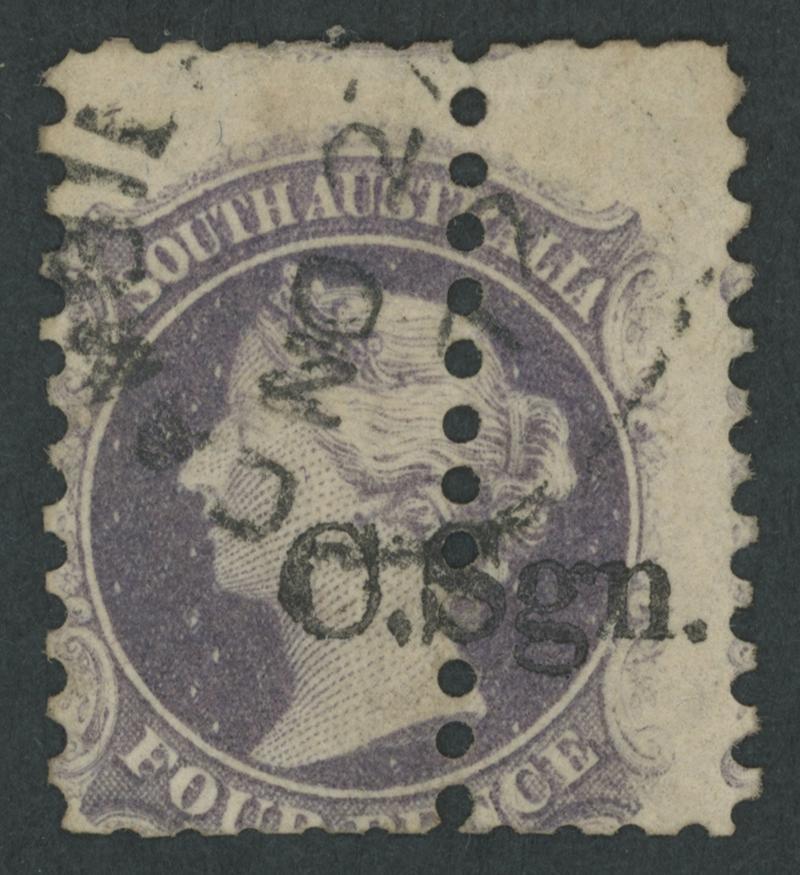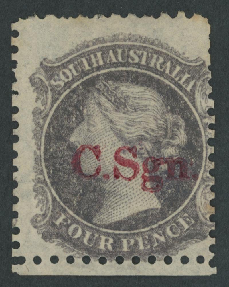 BLACK OVERPRINT: 'C.Sgn.' (seriffed font) on QV Perkins Bacon Large Star Wmk Irregular Compound Perf 11½-12½x10x10x10 4d deep purple SG DO173, an enormous stamp with fragments of the adjoining units above & below and the Overprint Misplaced to Right, some trimmed perfs at the base, fine 'GAMBIERTON/AU2/72/S.A' cds, Cat £1300. Rated RRRR; unrecorded unused. Ex 'Sir Humphrey' (Brian Farmer): sold for $670 (Sale 118 Lot 261). Chris Ceremuga Certificate (2019) states "extremely rare". Lord Vestey's example with extra vertical perfs through the design sold for £1080: see the next lot. Don Pearce's standard-size example with the overprint in correct position, also used at Gambierton sold for $2275 (Sale 247 Lot 126). (Image1)