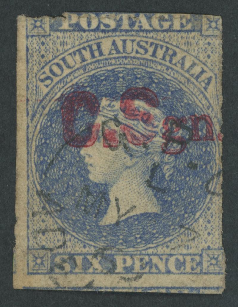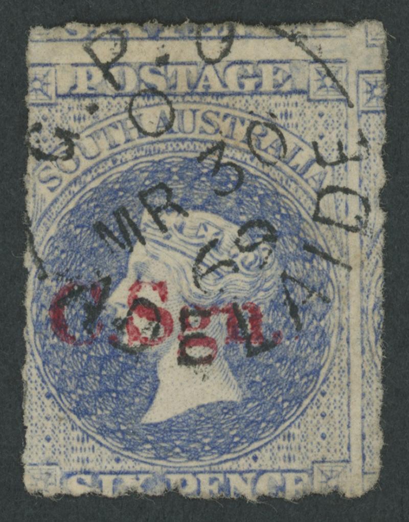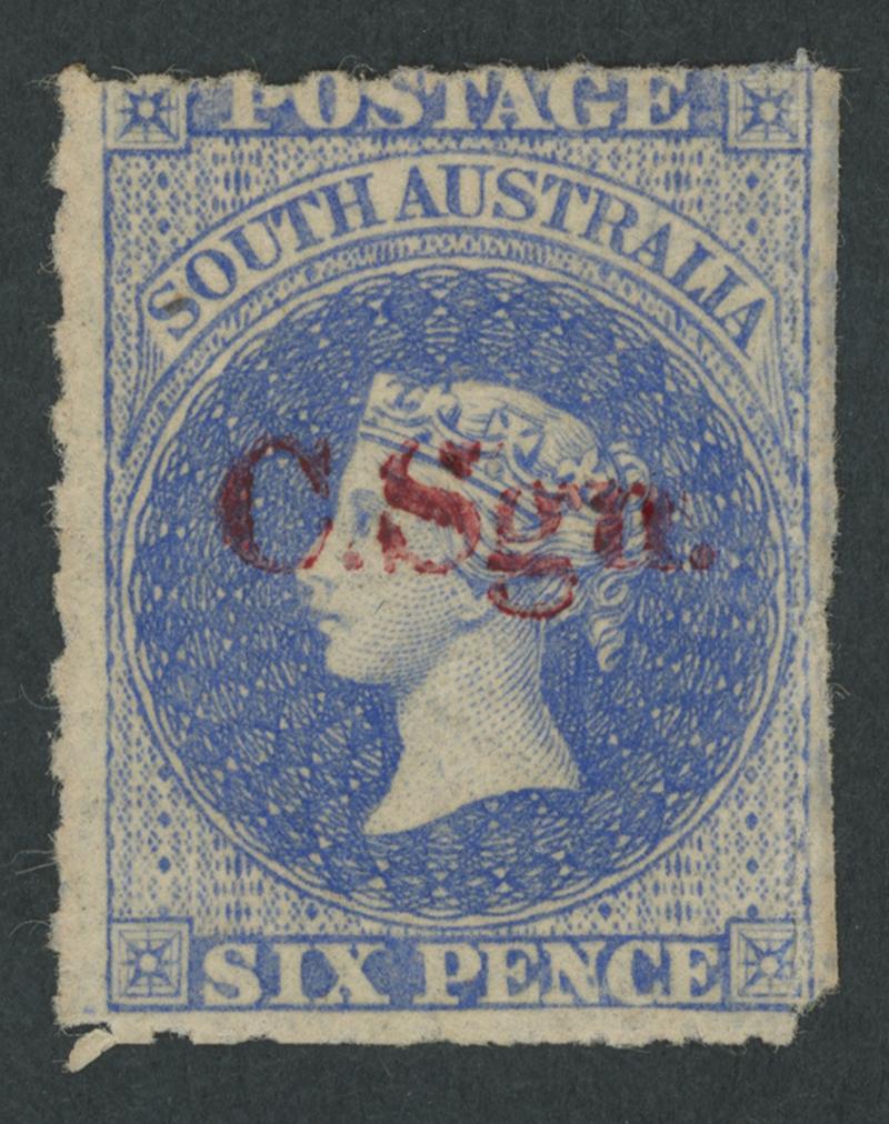 RED OVERPRINT: 'C.Sgn.' (hybrid overprint with Block 'C.S' & Seriffed 'gn') on QV Perkins Bacon Large Star Wmk Rouletted 6d ultramarine SG DO162a, rouletting except at the base where cut from the sheet well clear of the design, the apparent separation fault at upper-left is actually outside the roulettes, a little aged, light GPO cds of 'MY27/68', Cat £5500. Unlisted by Ron Butler & the only recorded example so it should be rated RRRRRR. Ex Don Pearce: sold for $10,180 (Sale 247 Lot 119). [See comments with Lo 220] (Image1)