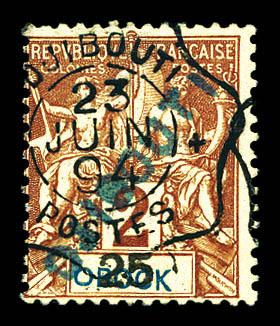 N°2, 5 paras bistre surcharge rouge sur son support. TTB (signé Scheller) Qualité: Oblitéré Cote: 400 euros (Image)
