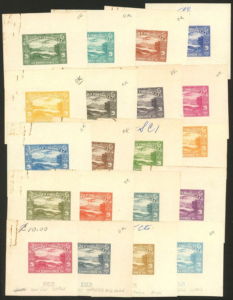 Year 1967, Airplanes, unissued design, 20 die essays in different colors, almost all with notes about colors, values etc. from the pre-production work, MNH sheets but with some small defects produced by the paper clips that hold them to the file of the printer, rare lot! (Image)