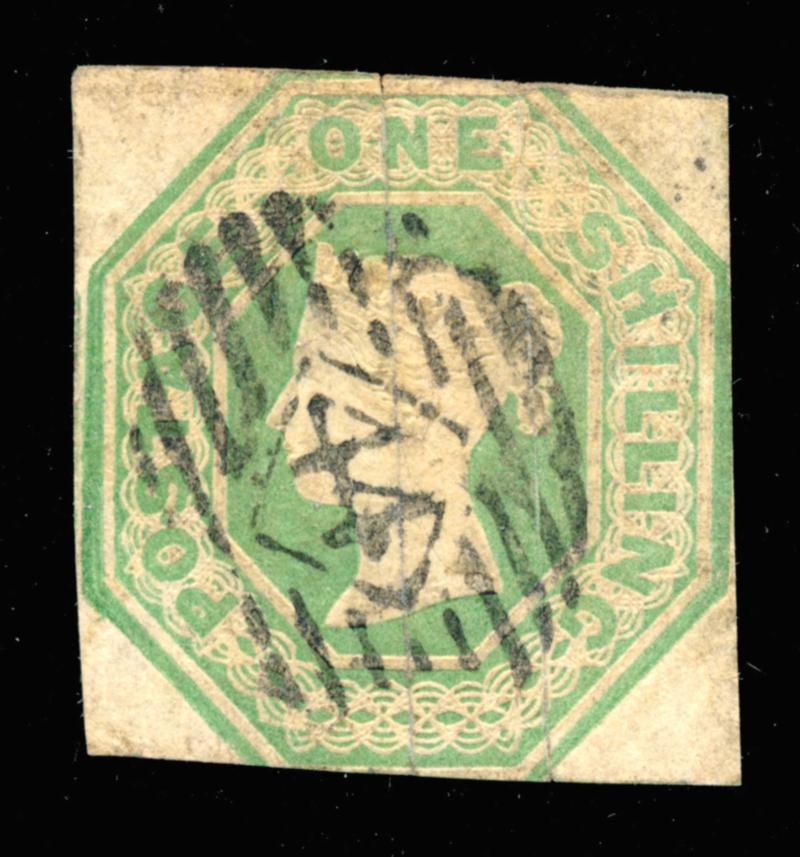 GREAT BRITAIN 1847 #5 STAMP F /O. Queen Victoria 1 shilling pale green, the stamp is canceled, imperforate, touching frame on 3 sides and has a very light thin on the forehead. Scott $1400.00 CAD. (Image1)