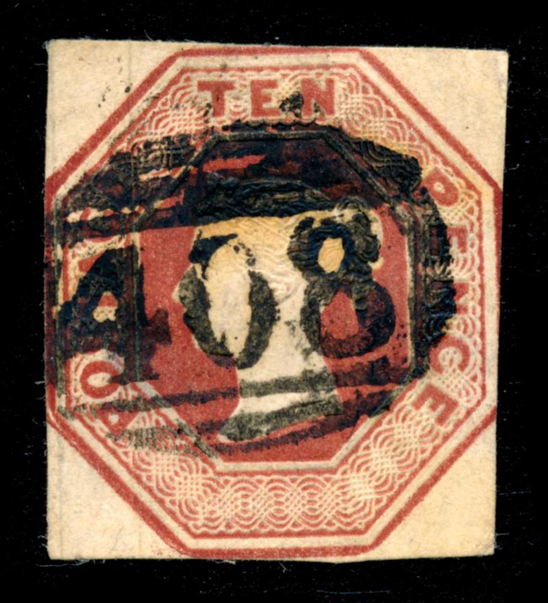 GREAT BRITAIN 1848 #6 STAMP VG-F /O. Queen Victoria 10 pence red brown, the stamp is imperforate, canceled, touching frame on 2 sides and has a thin in the middle on left side. Scott $2100.00 CAD. (Image1)