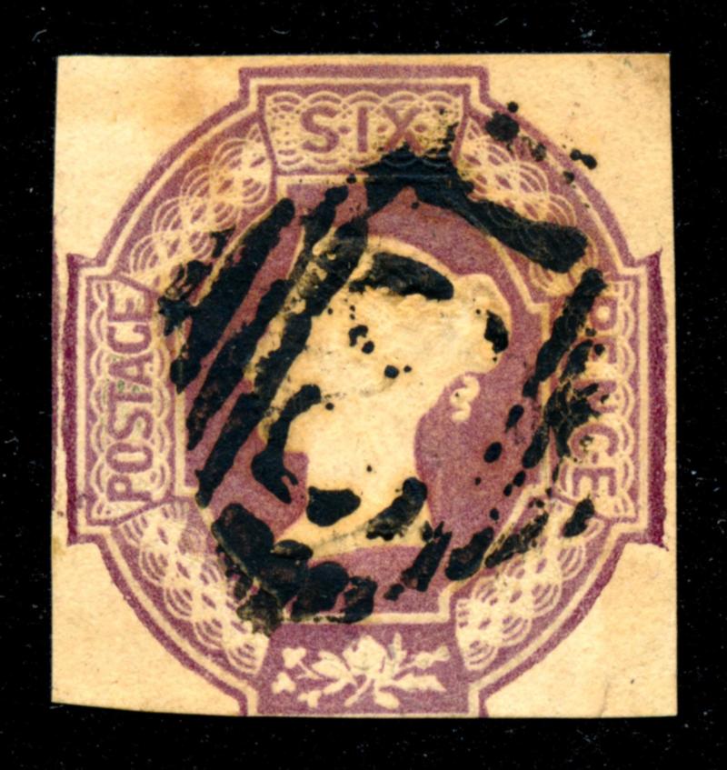 GREAT BRITAIN 1854 #7 STAMP F /O. Queen Victoria 6 pence red brown, the stamp is imperforate, canceled and touching frame at bottom. Nice copy of this stamp. Scott $1400.00 CAD. (Image1)