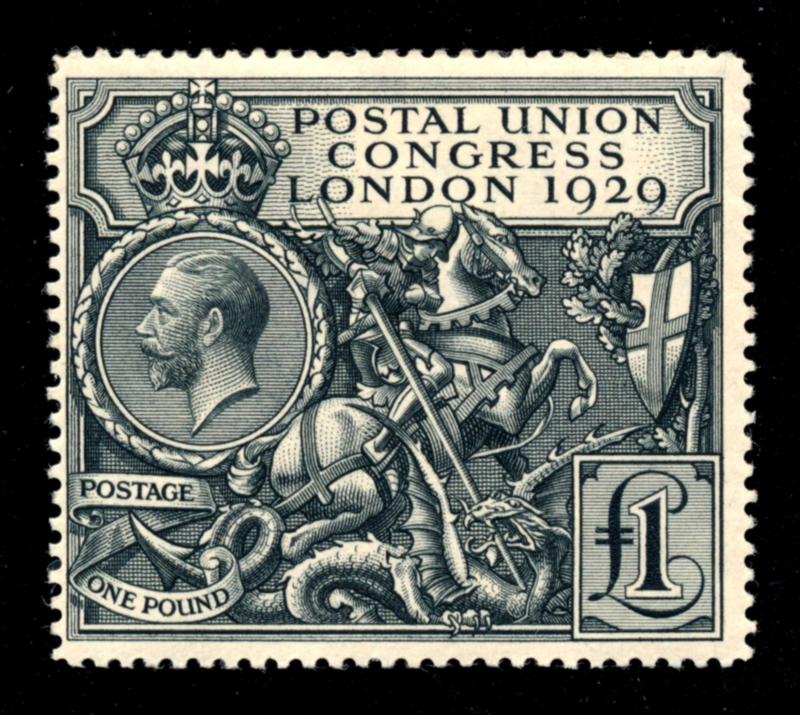 GREAT BRITAIN 1929 #209 STAMP VF *. Universal Postal Union 9th congress issue, stamp of 1 pound black, mint lightly hinged with a light pencil mark top left. It's a Beautiful stamp. Scott $1050.00 CAD. (Image1)