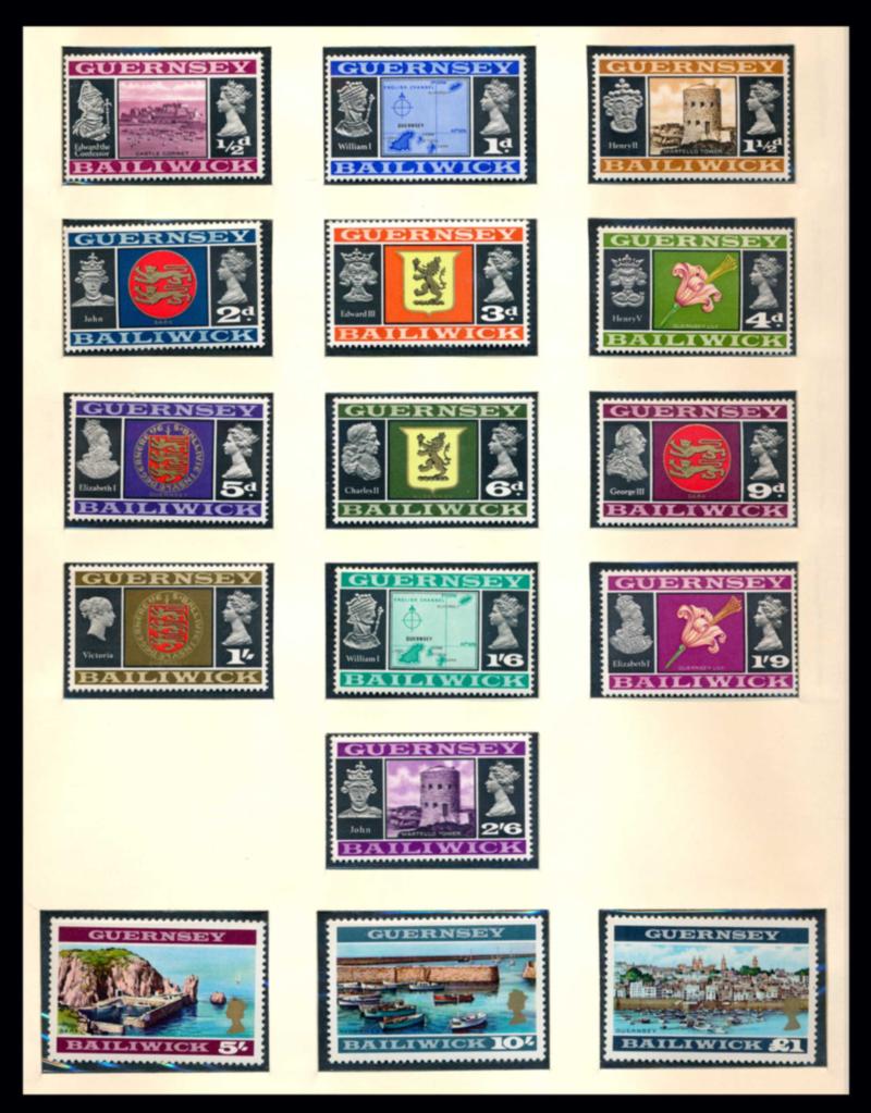 GUERNSEY 1941-84 COLLECTION STAMPS VF ** Lindner hingeless album with case containing 349 stamps, 4 souvenir sheets and 15 booklets mint never hinged. Almost complete for the period. Starting bid $100.00. (Image1)