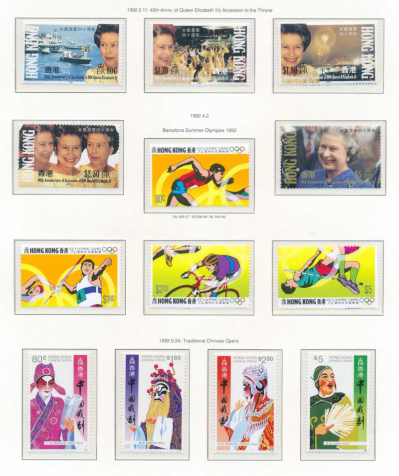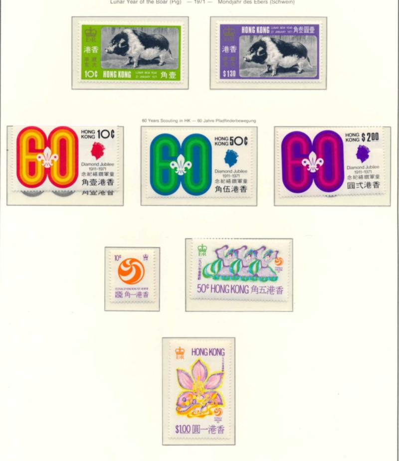 HONG KONG 1971-97 COLLECTION, STAMPS VF **. Lighthouse binder containing a nice collection of 331 stamps and 16 souvenir sheets mounted on Lighthouse pages and all mint never hinged. I noted #262-64, 268-69, 275-88, 275a-88a, 280-81, 296-98a, 306-08a, 309-11, 324-27, 388-403, 388a-403a, 435-38a, 443-46b, 461-64a, 482-85a, 490-504. 502ca, 502da, 502db, Need to be examined. Scott $2960.00 CAD. (Image1)