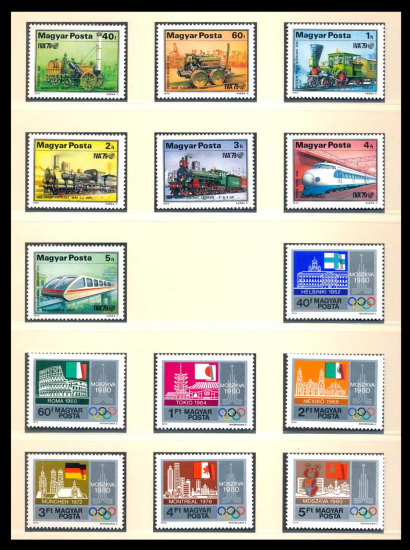 HUNGARY 1979-84 COLLECTION, STAMPS F-VF **. Lindner hingeless album with case containing a very nice collection complete for the period of 348 stamps and 38 souvenir sheets, all mint never hinged. Starting bid $100.00. (Image1)