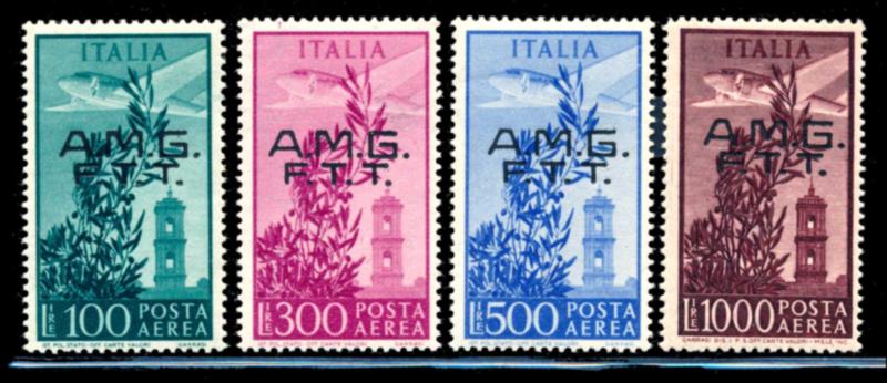 ITALY TRIESTE 1948 #C13-16 SET STAMPS VF **. Issued jointly by the Allied Government of the United States and Great Britain, complete set of Italian airmail stamps mint never hinged overprinted. Scott $650.00 CAD. (Image1)
