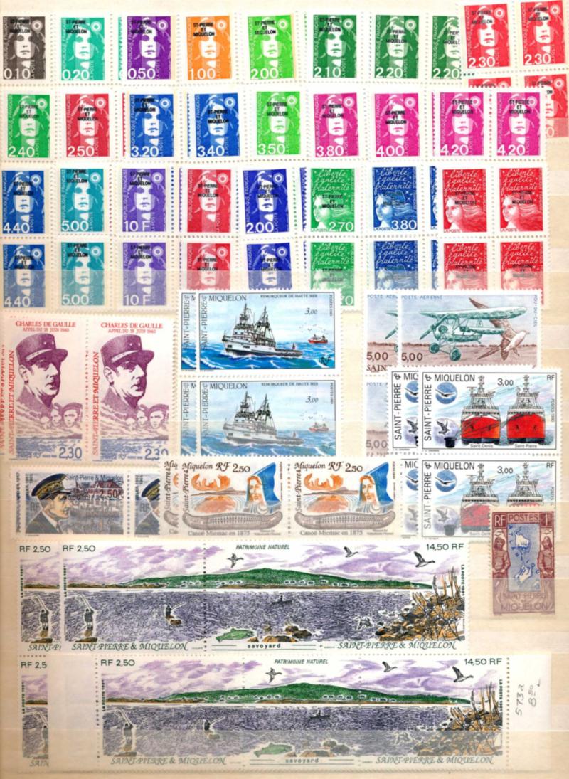 ST. PIERRE ET MIQUELON LOT, STAMPS VF ** Stockbook with a very nice selection of few hundred stamps mint never hinged in pairs, strips or blocks. Must be examined. I noted #238 in block of 25, 517, 519a, 522-44a, 552a, 564a, 568a, 573a, 581-82, 591, 604, 617-18, 628, 639, C67-68, C69-70, C74, all in blocks of 4 or pairs or strips. Scott $2540.00 CAD. (Image1)