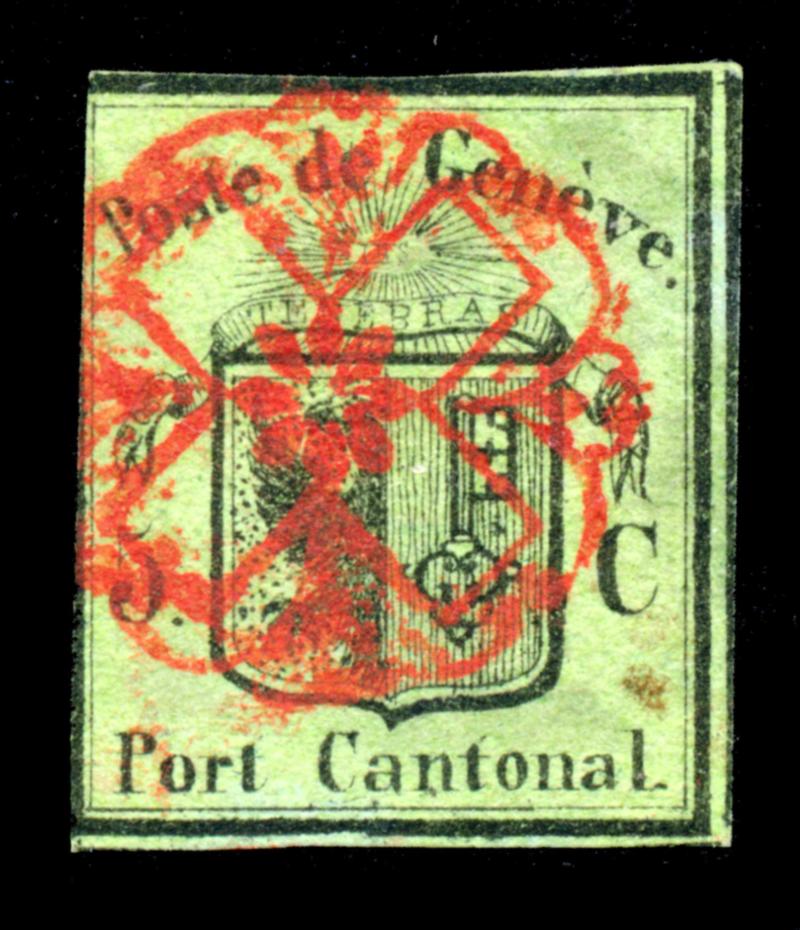 SWITZERLAND 1846 GENEVA #2L3 STAMP F /O. Geneva Coat of Arms, 5c black on yellow green, Geneva rosette postmark, clean and freshly colored piece, cut in the frame on the left. 2001 certificate from the Swiss Association of Philatelic Experts. Scott 2800.00 CAD. (Image1)