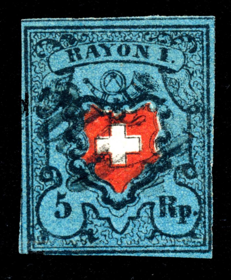 SWITZERLAND 1860 #5 STAMP F /O. Coat of Arms issue, 5Rp black/red/dark blue, full black frame around cross, cancelled with a black cancellation, clean with very fresh colors, light diagonal crease, otherwise in good condition. Swiss Expert Emil Rellstab 1995 certificat. Scott $1950.00 CAD. (Image1)