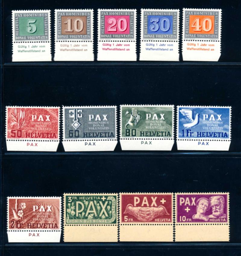 SWITZERLAND 1945 #293-305 SET SUPERB ** Pax issue, complete set of 13 stamps mint never hinged with bottom margins. Show piece of exceptional quality. 2024 certificate from Swiss expert Dr. Johannes Hoffner. Scott $740.00 CAD. (Image1)