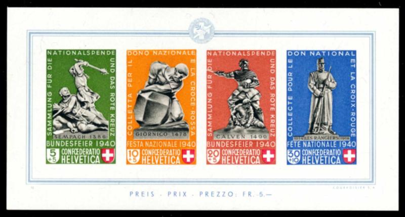 SWITZERLAND 1940 #B105 S/S XF ** National Fete Day issue, imperforate souvenir sheet of 4 stamps mint never hinged. Superb quality. 2024 certificate from Swiss expert Dr. Johannes Hoffner. Scott $455.00 CAD. (Image1)