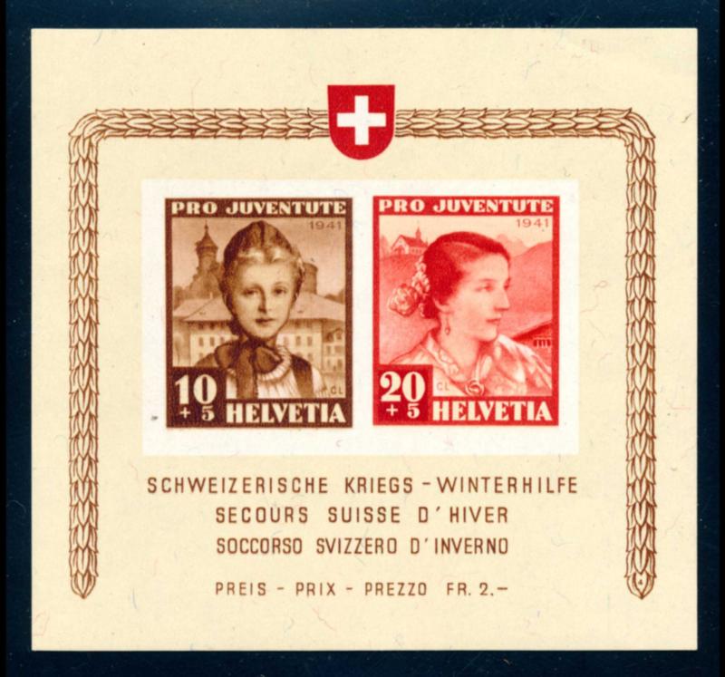 SWITZERLAND 1941 #B116 S/S XF **. Charity issue, imperforate souvenir sheet of 2 stamps mint never hinged. Superb quality. 2024 certificate from Swiss expert Dr. Johannes Hoffner. Scott $150.00 CAD. (Image1)