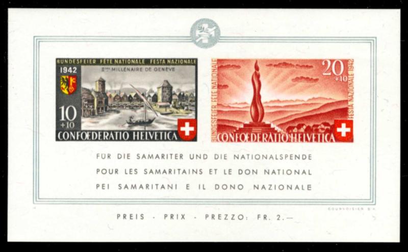 SWITZERLAND 1942 #B119 S/S XF **. 2000th Anniversary of the city of geneva issue, imperforate souvenir sheet of 2 stamps mint never hinged. Superb quality. 2024 certificate from Swiss expert Dr. Johannes Hoffner. Scott $120.00 CAD. (Image1)