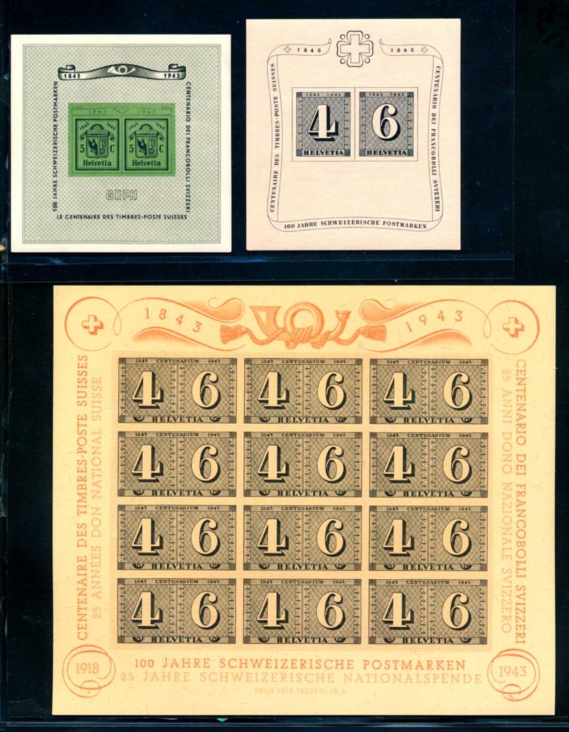 SWITZERLAND 1943 #B130-31 S/S's VF **. Centenary of postage stamps of Switzerland, complete set of 3 mint never hinged souvenir sheets. Scott $290.00 CAD. (Image1)