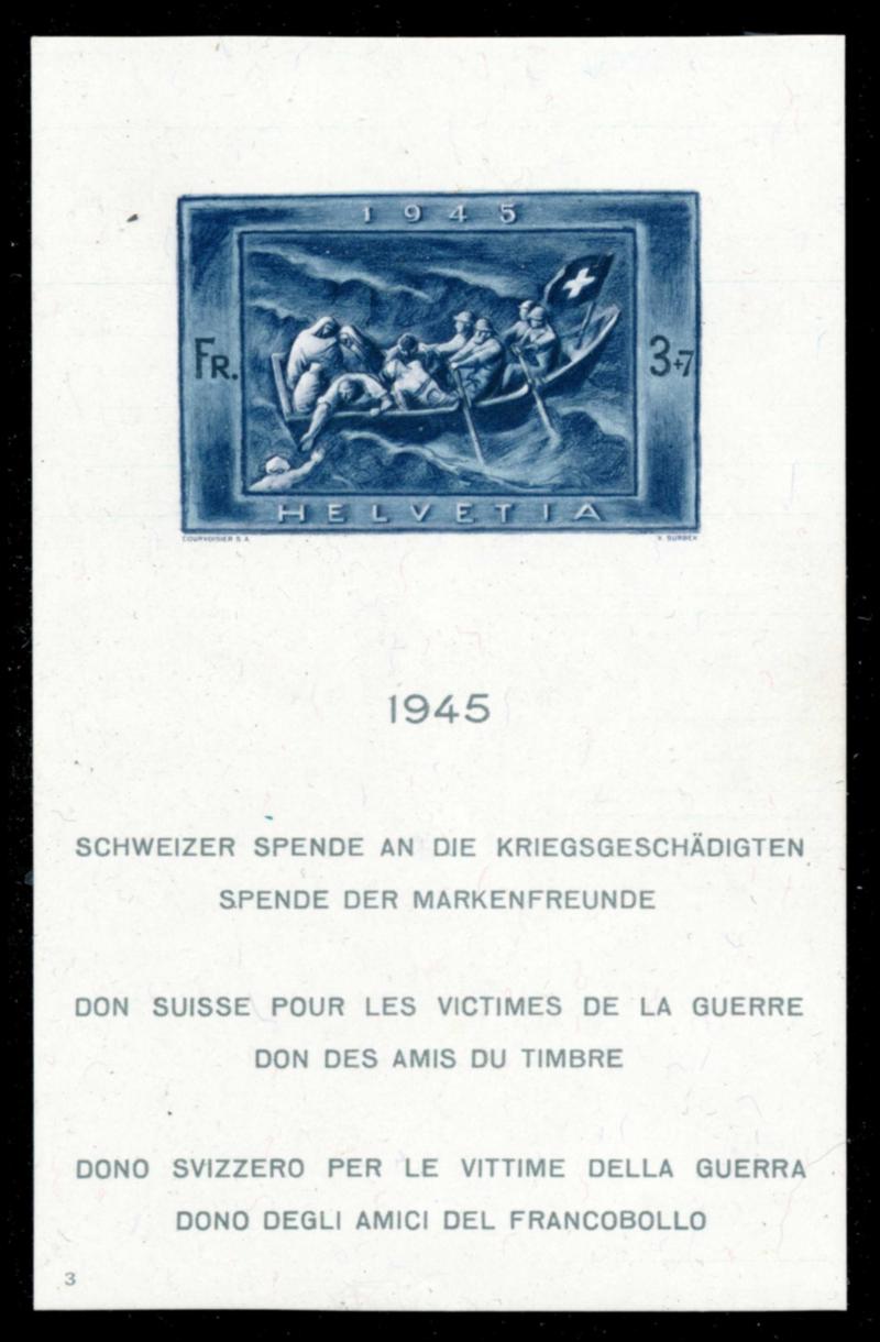 SWITZERLAND 1945 #B143 S/S XF **. Swiss donation for war victims, imperforate souvenir sheet mint never hinged. Superb quality. 2024 certificate from Swiss expert Dr. Johannes Hoffner. Scott $320.00 CAD. (Image1)