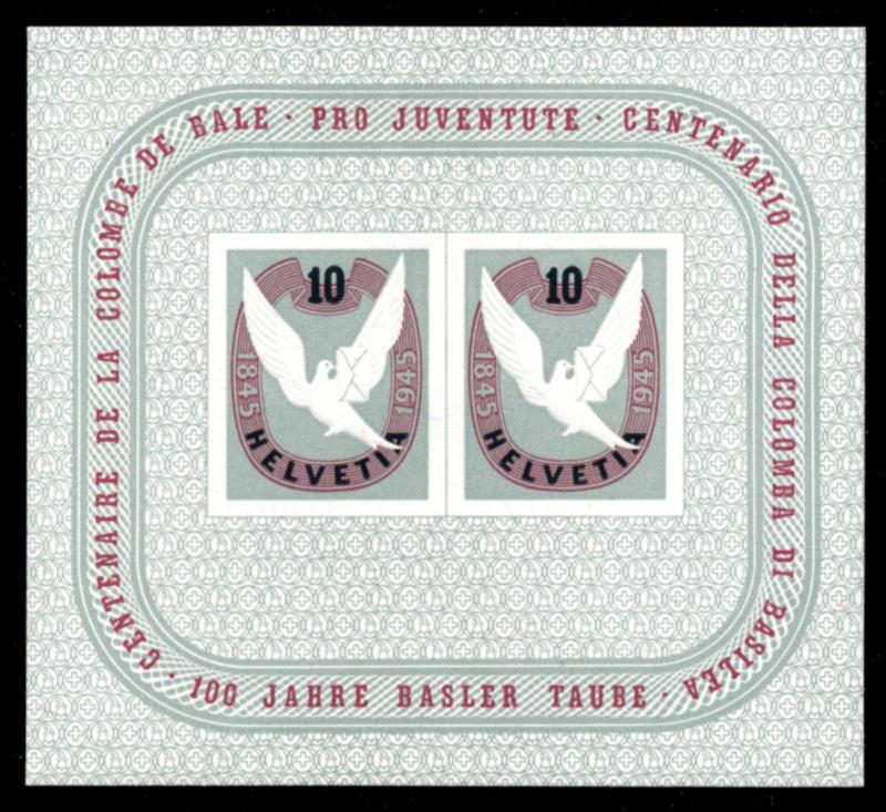 SWITZERLAND 1945 #B144 S/S XF **. Centenary of the basel cantonal stamp issue, imperforate souvenir sheet mint never hinged. Superb quality. 2024 certificate from Swiss expert Dr. Johannes Hoffner. Scott $155.00 CAD. (Image1)