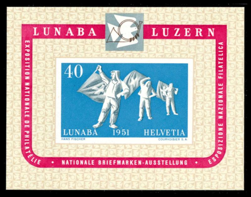 SWITZERLAND 1951 #B206 S/S XF **. Lunaba exhibition issue, imperforate souvenir sheet mint never hinged. Superb quality. 2024 certificate from Swiss expert Dr. Johannes Hoffner. Scott $390.00 CAD. (Image1)