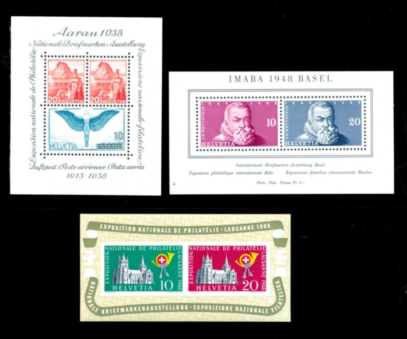 SWITZERLAND 1938-55 SELECTION S/S's VF **. Selection of 3 souvenir sheets mint never hinged. Numbers are: #242 Aarau 1938 philatelic exhibition, #352a National philatelic exhibition 1955 and #B178 Basel 1948 International philatelic exposition. Scott $315.00 CAD. (Image1)