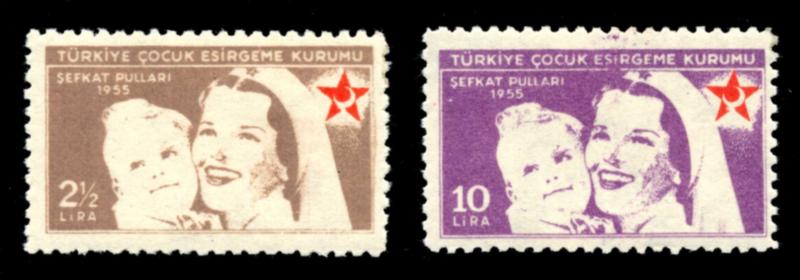 TURKEY 1955 #RA179-80 STAMPS F-VF **. Postal tax stamps issue, selection of 2 stamps mint never hinged (2,5L + 10L Nurse and Child). Scott $1750.00 CAD. (Image1)