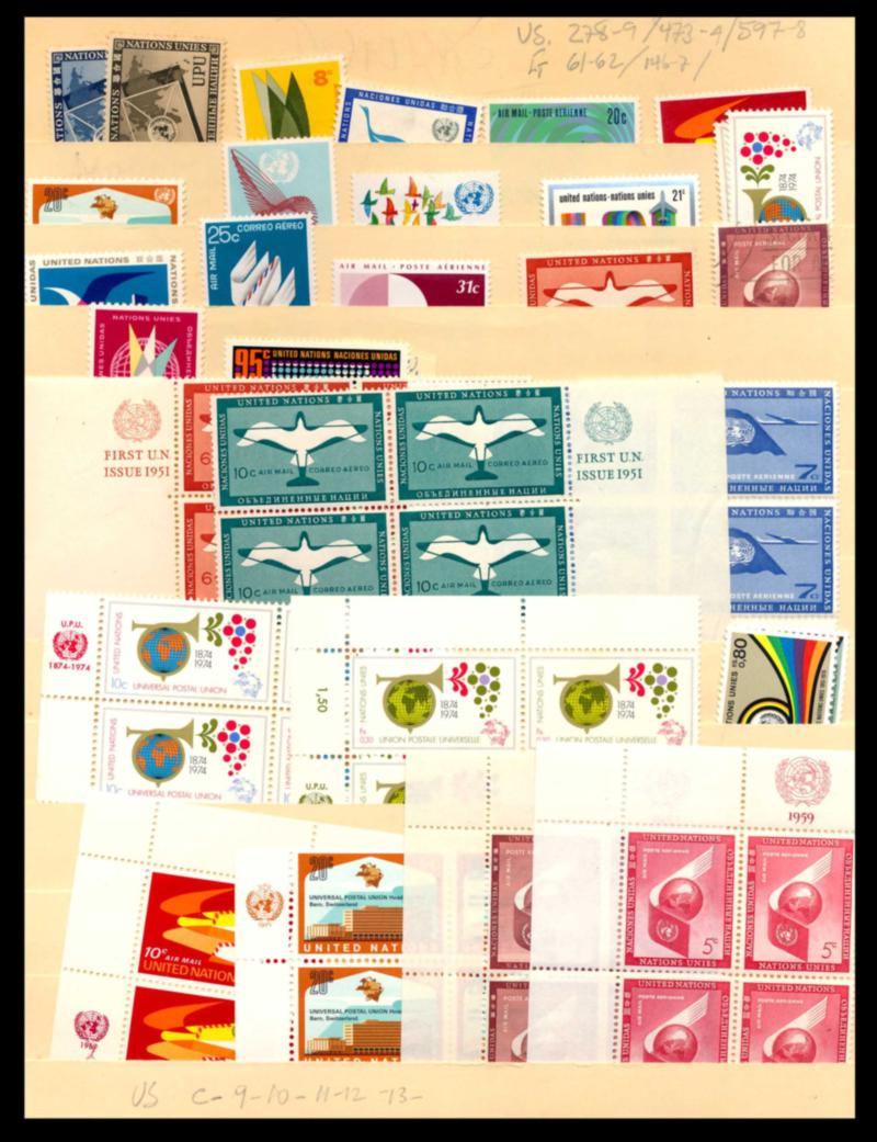 UNITED NATIONS 1951-96 COLLECTION + ACCUMULATION, STAMPS F-VF */**/O. 1 Harris album and 2 stockbooks containing few thousand stamps and first day covers. Need to be checked. Starting bid $60.00. (Image1)