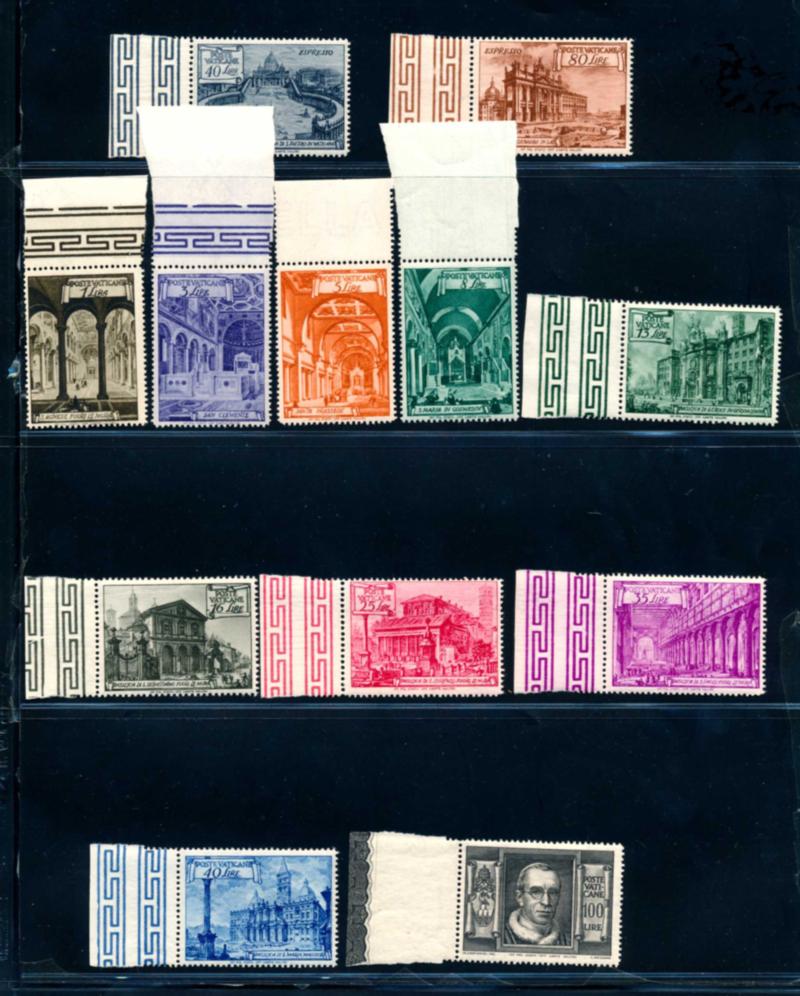 VATICAN 1949 #122-31 + E11-12 SET XF **. Basilicas and Pope Pius XII issue, complete set of 12 stamps with margins mint never hinged. Show piece set. Scott $200.00 CAD. (Image1)