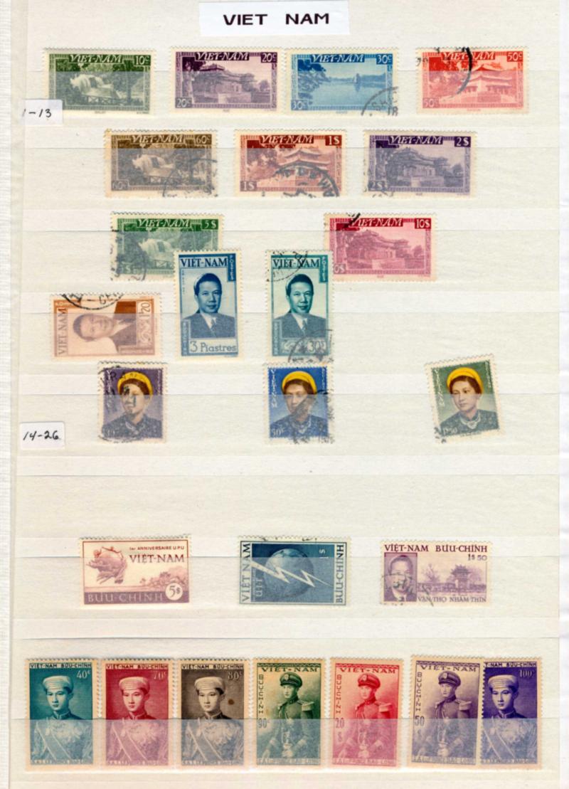 VIETNAM 1951-69 COLLECTION, STAMPS F-VF */**/O. Stockbook containing a collection of 546 stamps mint and used. Mostly complete sets and many mint never hinged. Need to be examined. Scott $1170.00 CAD. (Image1)