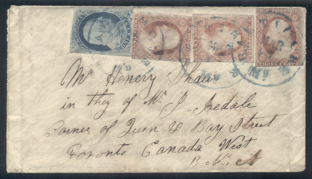 9, 11, 11A,1¢ Blue, Ty IV, 3¢ Claret, Ty I (2) and 3¢ Claret, Ty II on cover to Canada, #9 with four margins; #11 with two margins just in at bottom and right; #11 with 3 2/3 margins just in at lower right; and #11A with 2½ margins with upper right rounded corner, all tied to cover with three blue "BALTIMORE/Md./MAR/17" cds ccls. Cover addressed to "Mr. Henry Shaw/in they of W.I. Iredale/Corner of Queen & Bay Street/Toronto Canada West/B.N.A." Very nice cover! (Image)