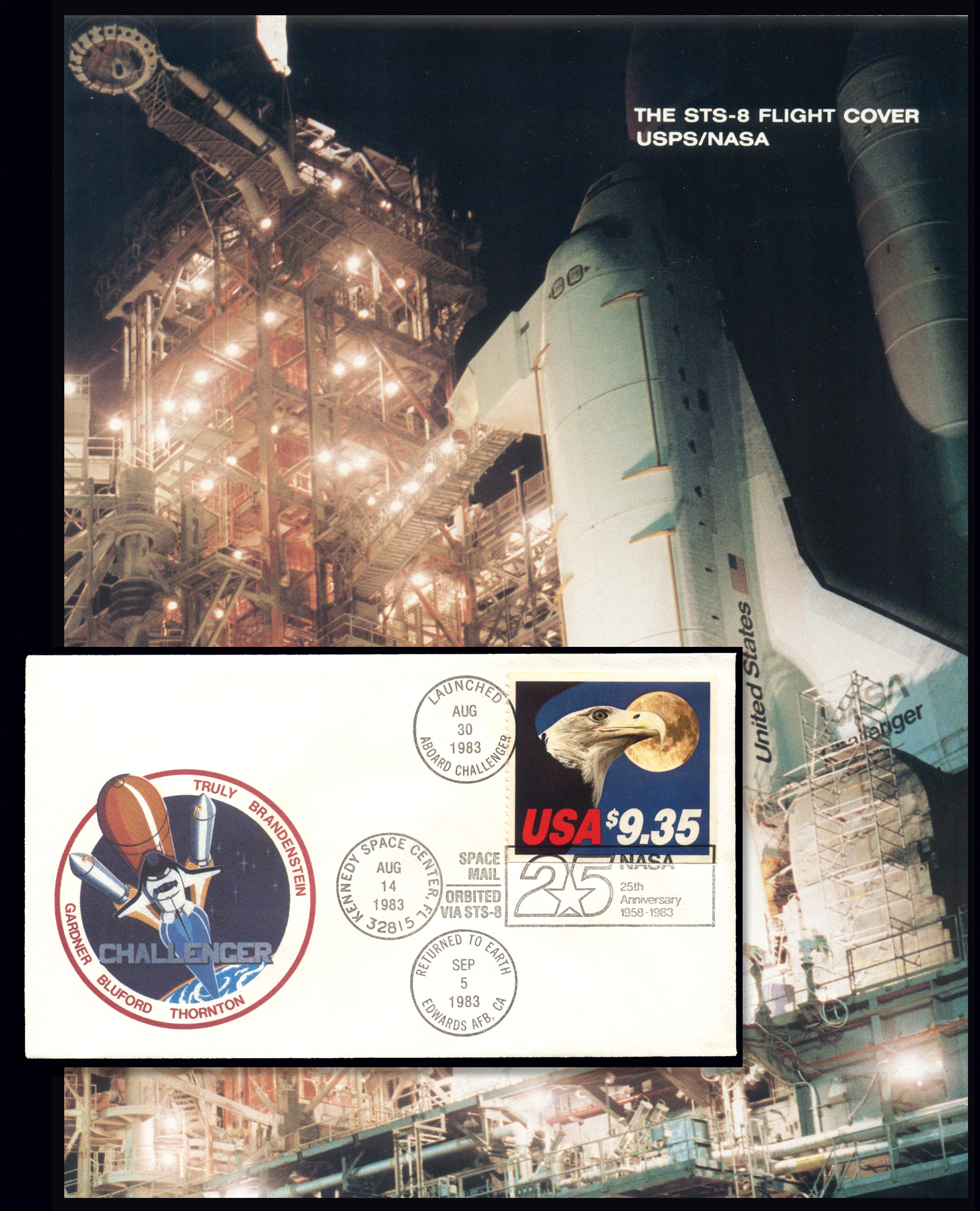 1909,$9.35 Bald Eagle and Moon on STS-8 Flight Cover, XF, unaddressed, with multi-colored NASA/USPS cachet, flown aboard the "USS Challenger" space shuttle, which exploded 2½ years later, with original folio number 230482. COSMOS Cat #1800A (Image)