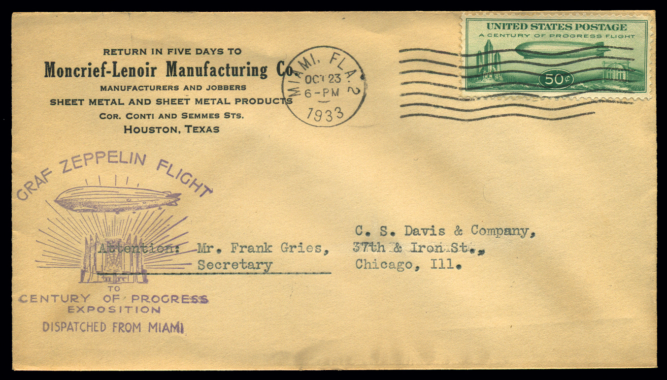 C18,50¢ Graf Zeppelin, on Graf Zeppelin flight cover, VF, Sieger cat. # 242.8 for flight from Miami, FL-Chicago, IL, cv €175 about $205, cover with light toning and with all appropriate markings (Image)