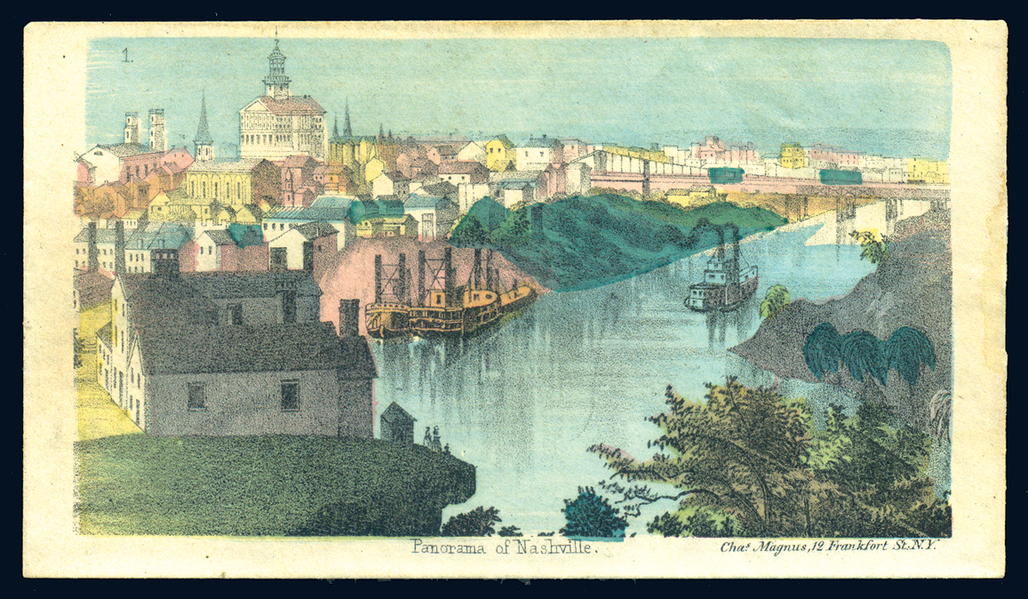 Charles Magnus genuine Patriotic Cover,(colorized) with added address, stamp and cancel, Scene is a panoramic view of Nashville, Tennessee circa 1865. The opposite side has a #65 3¢ Rose with a fake cancel, 2022 PSE certificate included. The star of this cover is the Charles Magnus printing (Image)
