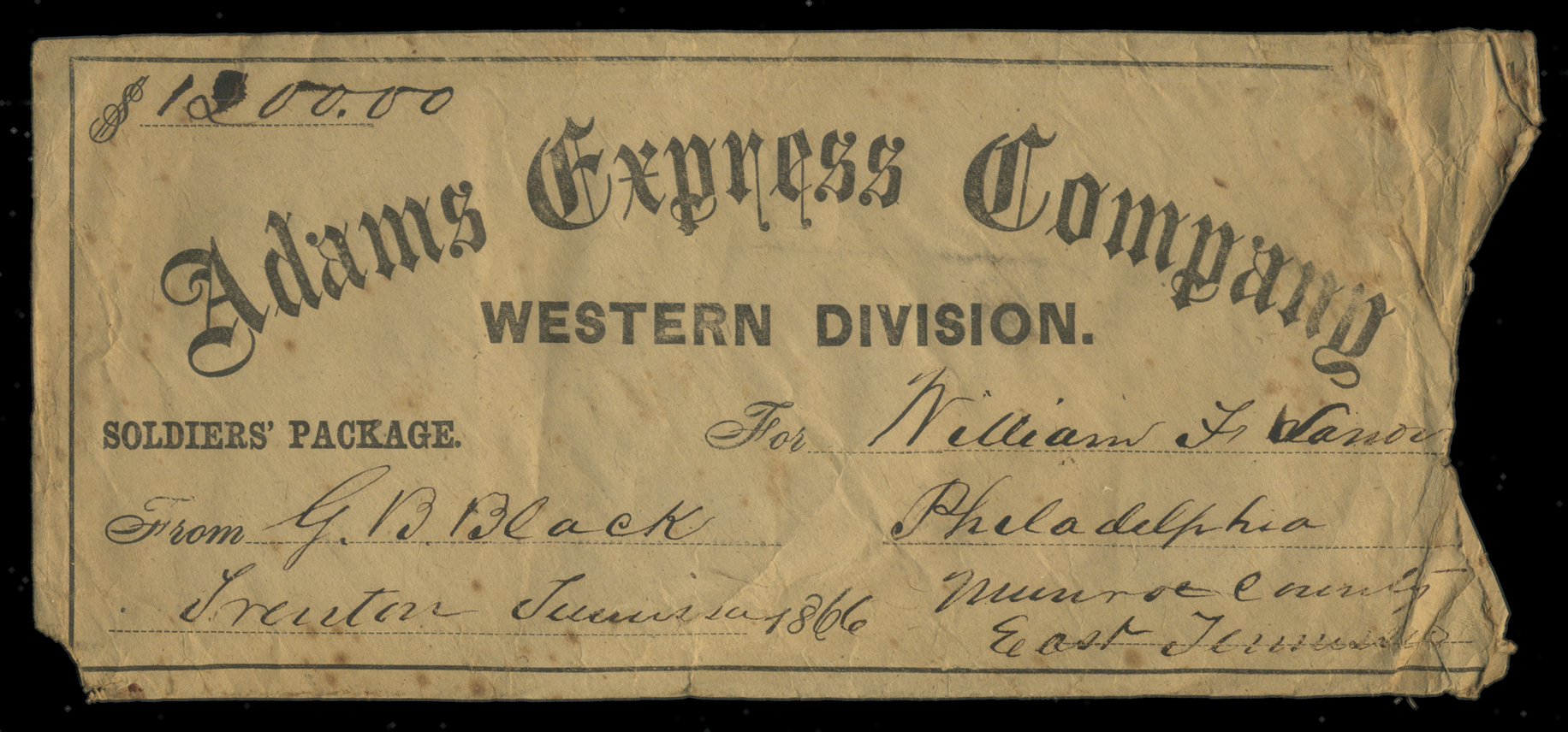 Adams Express Co. 1866,Shipping envelope, 8 3/4" x 3 7/8" opened roughly at right, front reads "$1200.00/Adams Express Company/WESTERN DIVISION." At Lower Left "SOLDIERS" PACKAGE./From G.B. Black/Trenton Tennessee 1866"; at lower right "For William F. Lenoir/Philadelphia/Munroe County/East Tennessee." On the reverse are 5 red wax seals, which read "ADAMS EXPRESS Co./TRENTON/TENN.", small piece missing at lower left corner. Rarely seen! (Image)