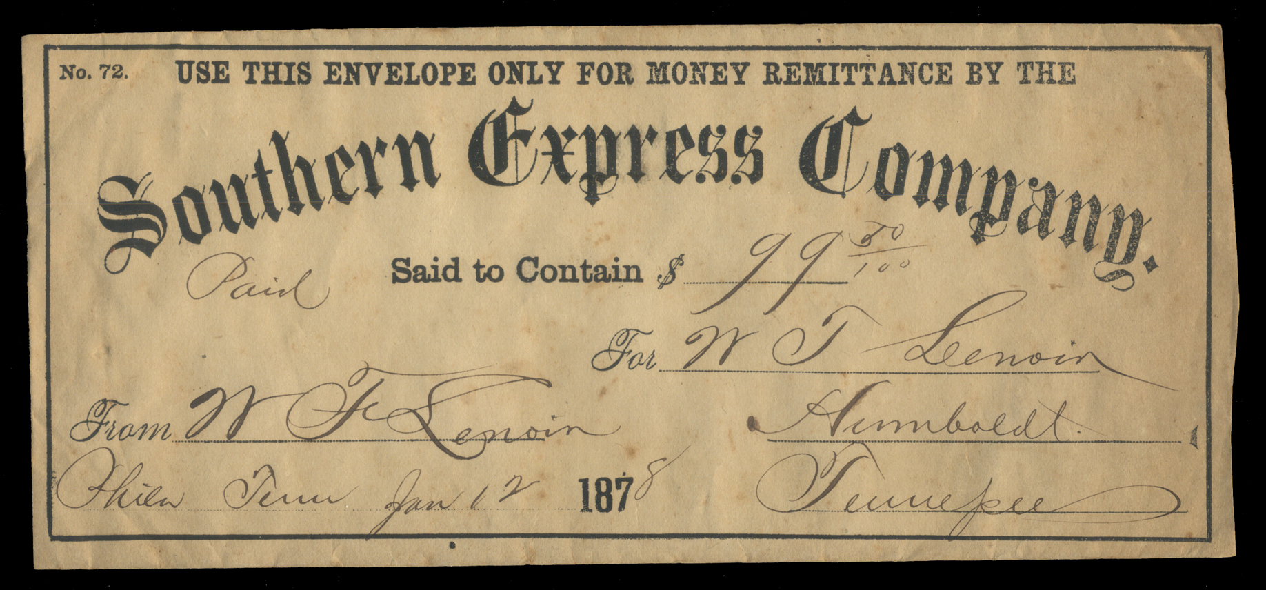 Southern Express Co. 1878,Shipping envelope, 8 3/4" x 3 7/8" opened neatly at right, front reads "No. 72. USE THIS ENVELOPE ONLY FOR MONEY REMITTANCE BY THE/Southern Express Company./Paid/Said to contains $99.50." At lower left "From W.F. Lenoir/Phila Tenn Jan 12 1878"; and at lower right "For WF Lenoir/Humboldt/Tennessee". Reverse marked "Counted & Sealed by JR Spark/In presence of WT Lenoir". The backflap secured with (5) black wax seals, each reading "SOUTHERN EXPRESS CO./PHILADELPHIA/TENN." Seldom seen and in excellent condition (Image)