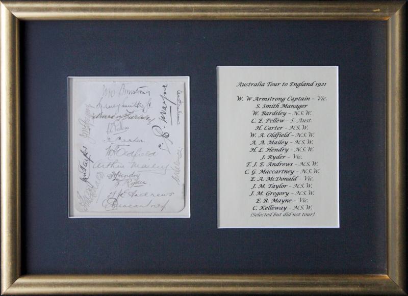 1921 Australian Team autograph page with 16 signatures - Warwick Armstrong, Sydney Smith Jr (manager), Warren Bardsley, Nip Pellew, Hanson Carter, Bert Oldfield, Arthur Mailey, Stork Hendry, Jack Ryder, Tommy Andrews, Charlie Macartney, Ted McDonald, Johnny Taylor, Jack Gregory, Charlie Kelleway & Edgar Mayne, window mounted with list of players, archivally framed & glazed, overall 37x27cm. (Image1)