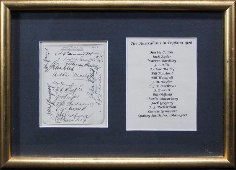 1926 Australian Team autograph page with 16 signatures - Herbie Collins (captain), Clarrie Grimmett, Jack Ryder, Sydney Smith Jr (manager), Warren Bardsley, John Ellis (twice), Arthur Mailey, Bill Ponsford, Bill Woodfull, Johnny Taylor, Tommy Andrews, Sam Everett, Bert Oldfield, Charlie Macartney, Jack Gregory & Arthur Richardson, window mounted with list of players names, archivally framed & glazed, overall 37x27cm. (Image1)