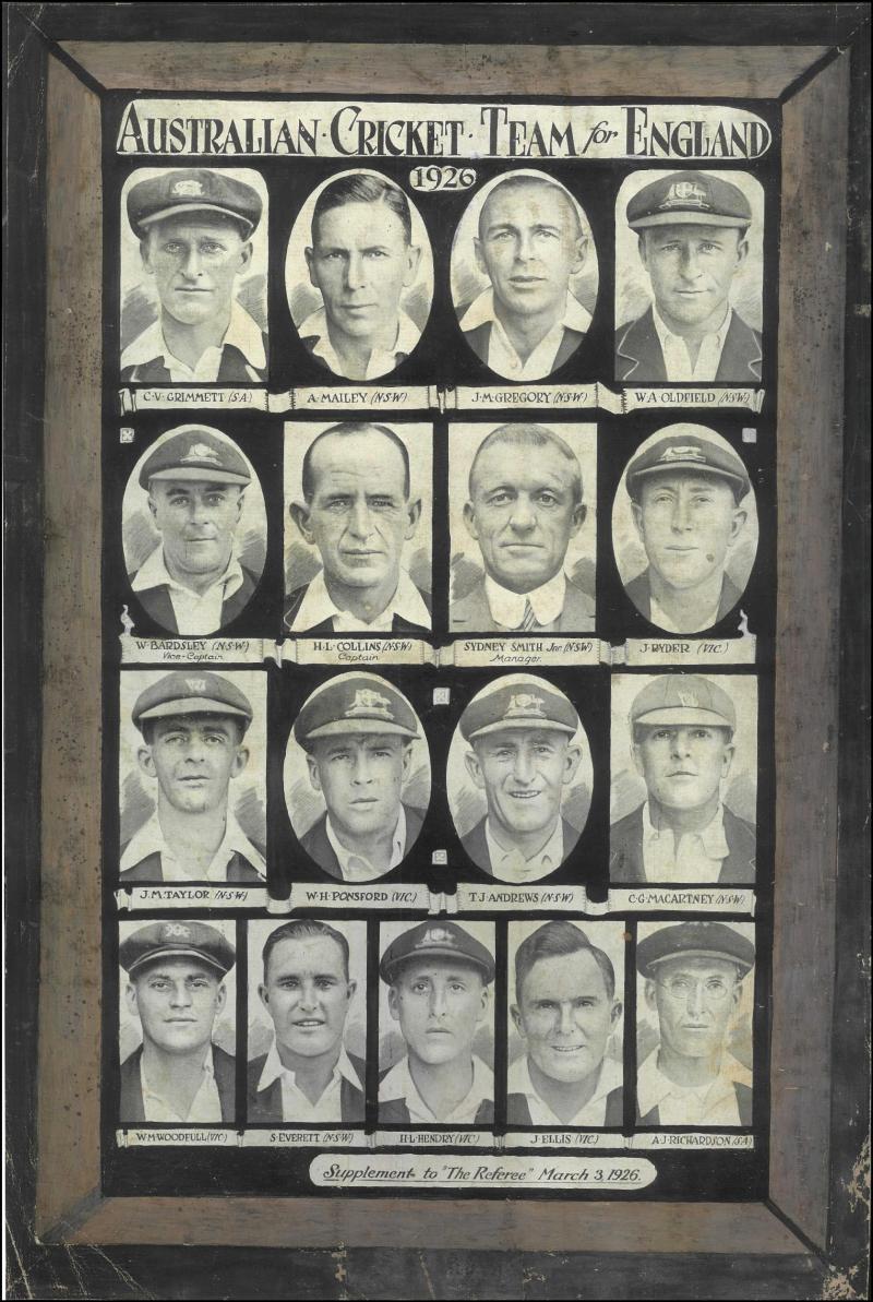 1926 Australian Team 'Australian Cricket Team for England 1926' supplement to 'The Referee' March 3 1926, decorated by the previous owner to look as though it has been framed, Fair condition. (Image1)