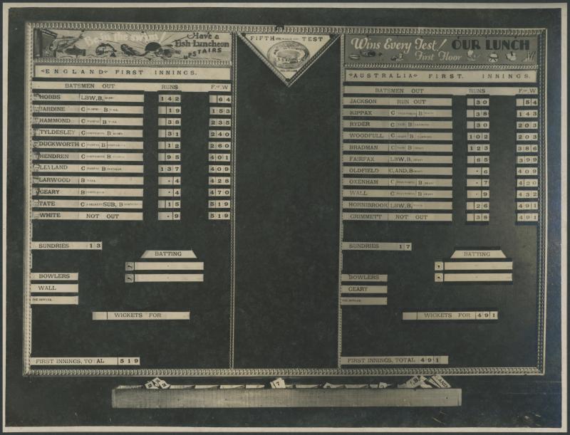 1928-29 Ashes Series Leather-bound album 'Test Matches 1928-29, From J.Cantor, Macquarie Place, Sydney, N.S.Wales, Australia', containing 10 large format photographs of scoreboards of the Test matches at the end of each innings as displayed in Cantor's restaurant in Sydney. A unique record of Bradman's first test series. (Image1)