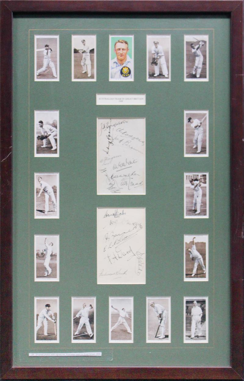 1938 Australian Team display comprising two autograph pages with 16 signatures - Jack Fingleton, Sidney Barnes, Charlie Badcock, Bill Brown, Bill Ferguson (scorer), Merv Waite, Charlie Walker, Lindsay Hassett, Bill Jeanes, Stan McCabe, Bill O'Reilly, Ben Barnett, Ernie McCormick, Frank Ward, Chuck Fleetwood-Smith & Ted White, window mounted with 16 cigarette cards (with the Don Bradman card signed), framed & glazed, overall 36x55cm, Fine condition. (Image1)